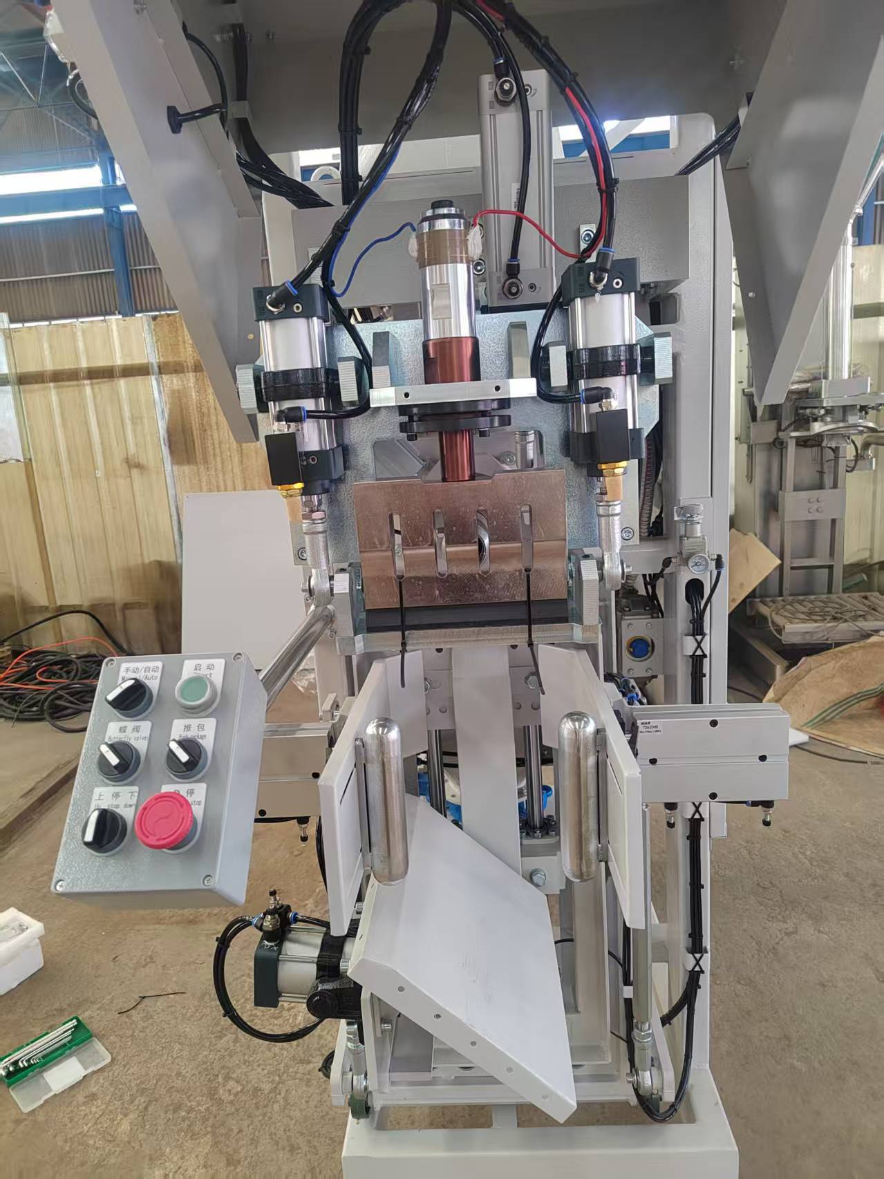 Sistema de sellado por ultrasonidos:Un dispositivo que utiliza vibraciones mecánicas de alta frecuencia para derretir y fusionar las capas termoplásticas de la válvula de la bolsa, creando un sello hermético sin calor, pegamento o costuras.